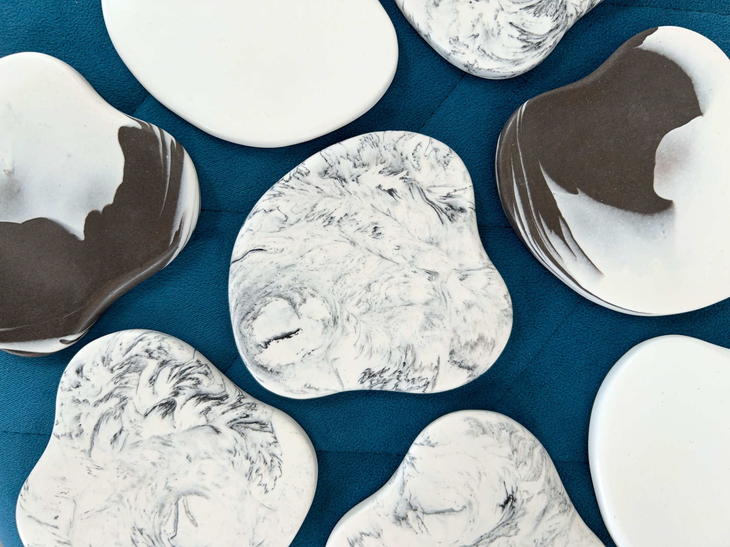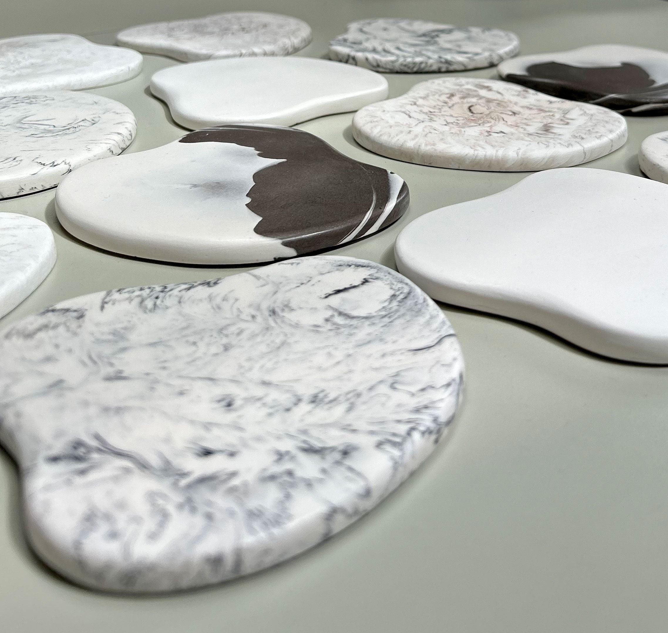 Alle produkterne har Jesmonite som det primære materiale – et bæredygtigt og yderst miljøvenligt alternativ til andre traditionelle støbematerialer.